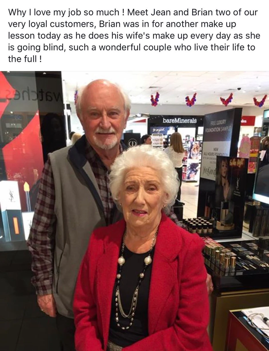 "Upoznajte Džin i Brajana, dvoje naših vrlo vernih mušterija. Brajan je danas bio na još jednom času šminkanja. Šminka svoju suprugu svaki dan, otakako je ona počela da gubi vid i u jednom trenutku će skroz oslepeti. Tako predivan par koji živi punim plućima", napisao je Skot.