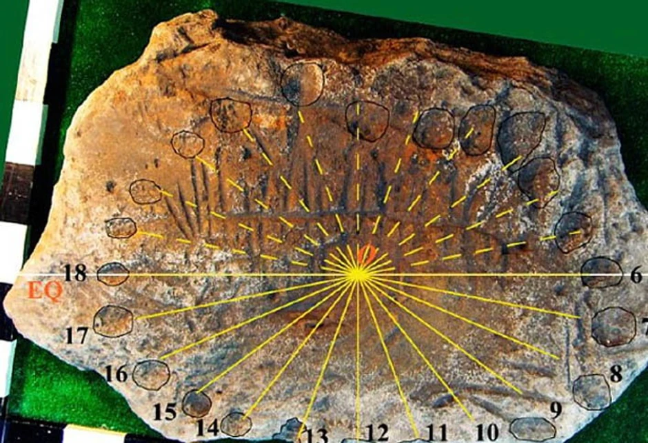 Osim linija, vidljiva su i kružna udubljenja koja označavaju sate, postavljena na elipsoidnoj putanji.