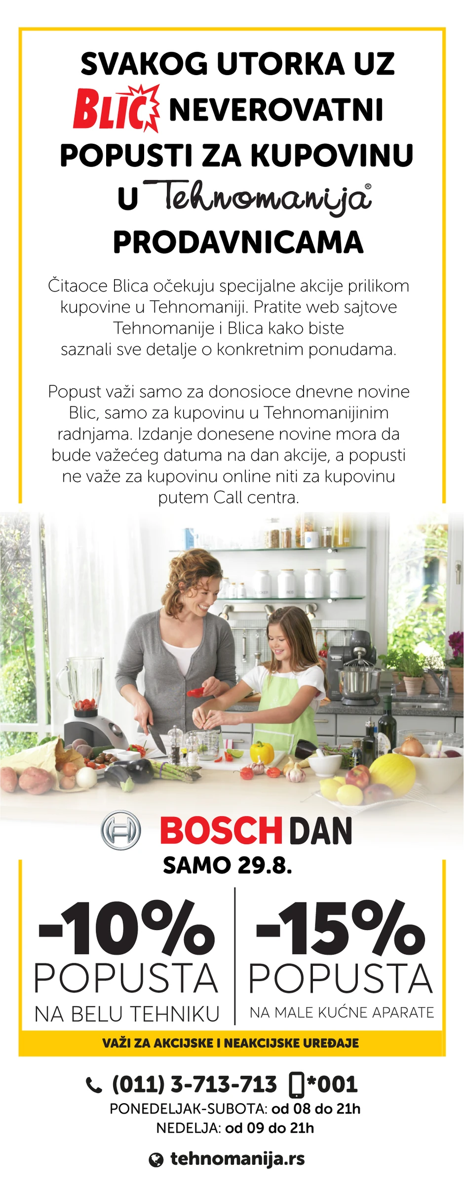 Popust važi samo za donosioce dnevne novine Blic, samo za kupovinu u Tehnomanijinim radnjama. Izdanje donetih novina mora da bude važećeg datuma na dan akcije, a popusti ne važe za kupovinu online niti za kupovinu putem Call centra.