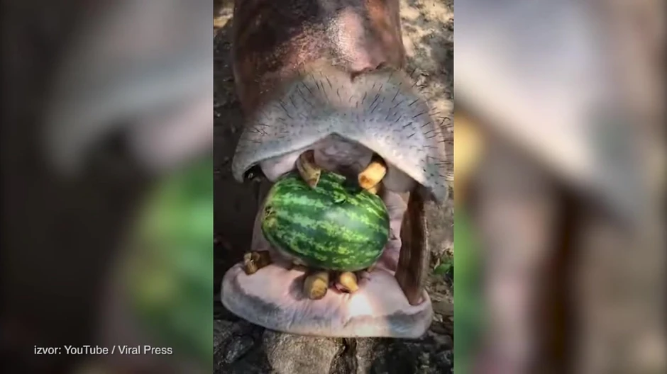 Isprva je izgledalo kao da će ljudi mučiti nilskog konja, a vrlo brzo je postalo jasno da itekako znaju šta rade i da je za ovu životinu savladavanje lubenice prost zadatak.