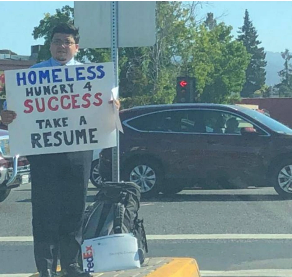 Nakon što se, kao i obično, probudio na "svojoj" klupi u gradu Mauntin Vju (Kalifornija), dvadesetšestogodišnji veb developer krenuo je do najbližeg autoputa. Sa sobom je poneo svoju biografiju u mnoštvo primeraka i stao pored puta s kartonom u ruci. Na njemu je pisalo: