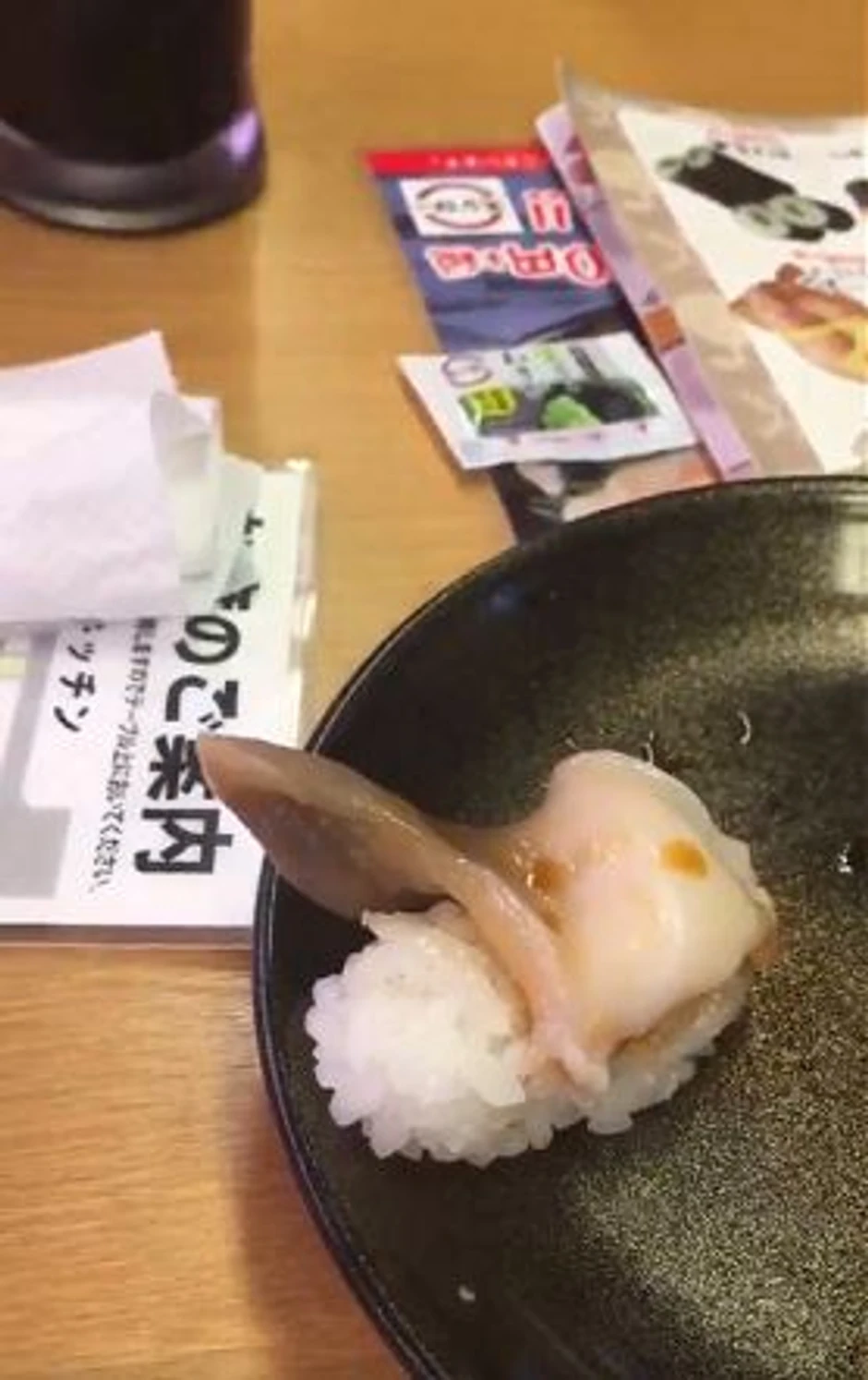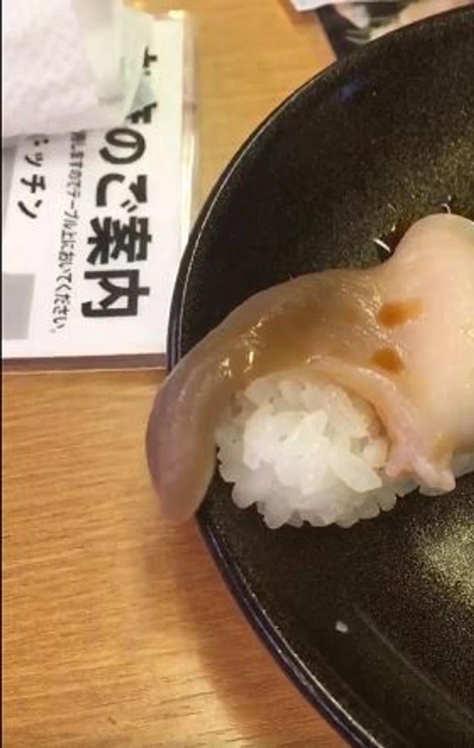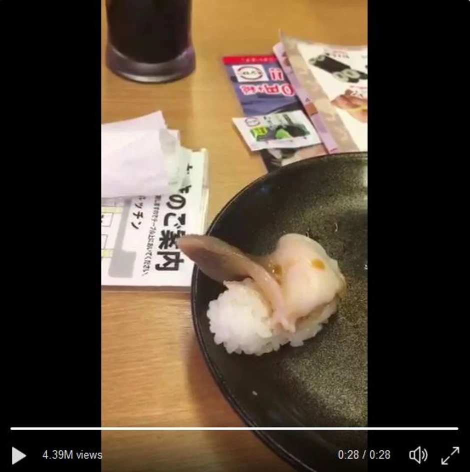 Ovaj video je snimljen u jednom od najpoznatijih japanskih lanaca restorana Sushiro koji je poznat po tome što za sebe tvrde da koriste najsvežije moguće sirovine. Ali, mušterija koja je bila naručila "iki hokkigai" suši nije mogla da veruje da će se školjka, čije je meso osnovni sastojak ovog specijaliteta, pomerati i van svog oklopa.