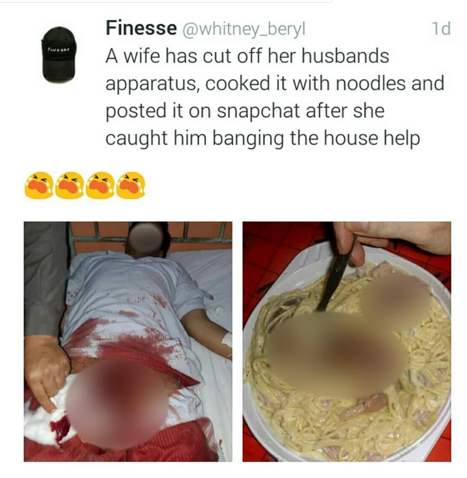 Sve je počelo sa tvitom jednog tviteraša koji je ispod fotografija okrvaljenog muškarca i tanjira sa nudlama, napisao kako se radi o čoveku koji je prevario ženu sa kućnom pomoćnicom, što je njegova supruga saznala nakon čega je rešila da ga brutalno kazni.