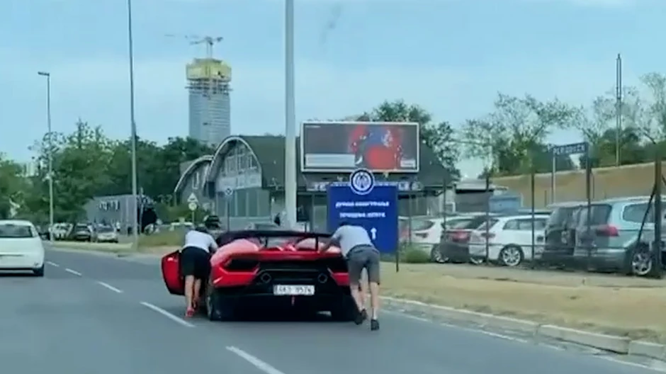 Žitelji Beograda koji su se juče našli na Novom Beogradu, prisustvovali su pomalo neuobičajnoj sceni za naše puteve. Naime, da li zbog nestanka goriva ili nekog drugog kvara, dva mladića su morala da guraju luksuzni i supoceni automobil marke Lamburdžini, što je izazvalo veliku pažnju kod drugih učesnika u saobraćaju.