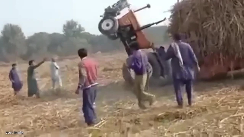 Na snimku koji je pred vama vide se radnici i natovareni traktor sa prikolicom, koji bez ikakvog razloga gubi kontrolu, počinje da se vrti, podiže prednji deo i na kraju gubi točak koji je poleteo metrima u vis.