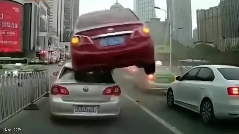 Dok su vozila stajala u koloni, odjednom je iz drugog pravca naletelo drugo vozilo, koje je preletelo ogradu, dva automobila i palo na treće. Zatim se skotrljalo između dva automobila.