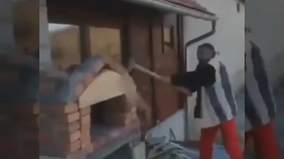 Dok se drugi čovek, najverovatnije majstor, nalazio na na krovu kuće, vidno ljutiti muškarac je udarao po ozidanom roštilju.