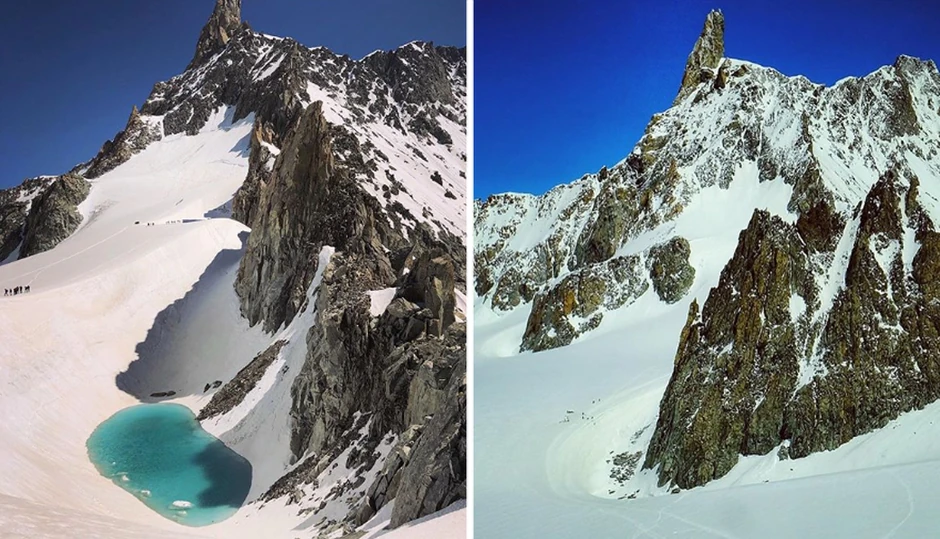Mestre je slike jezera postavio na svoj Instagram nalog 28. Juna, samo deset dana nakon što je njegov kolega, alpinista, Pol Todhanter fotografisao isti deo, samo pokriven snegom.