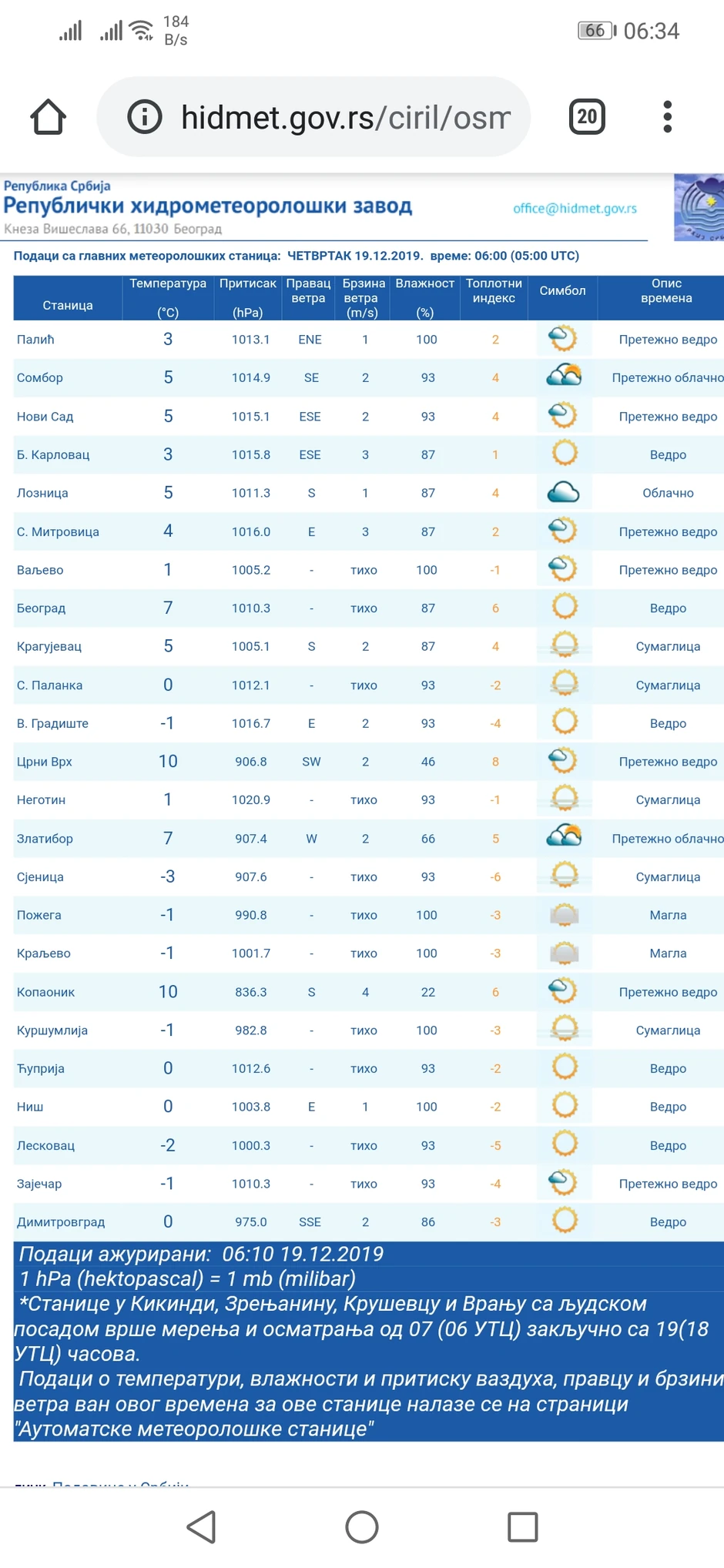 Dok je u Beogradu jutros u 6.00 bilo sedam stepeni, u Novom Sadu i Loznici pet, Valjevu i Negotinu, jedan stepen, a u Kraljevu, Zaječaru, Kuršumliji, Požegi i Velikom Gradištu minus jedan – u Leksovcu čak minus dva, a u Sjenici minus tri – na Crnom vrhu i Kopaniku je u isto vreme izmereno neverovatnih plus 10 stepeni Celzijusovih. U Ćupriji, Nišu, Dimitrovgradu i Smederevskoj Palanki jutros je bilo nula stepeni, dok je na Zlatiboru je izmerena temperatura od sedam.