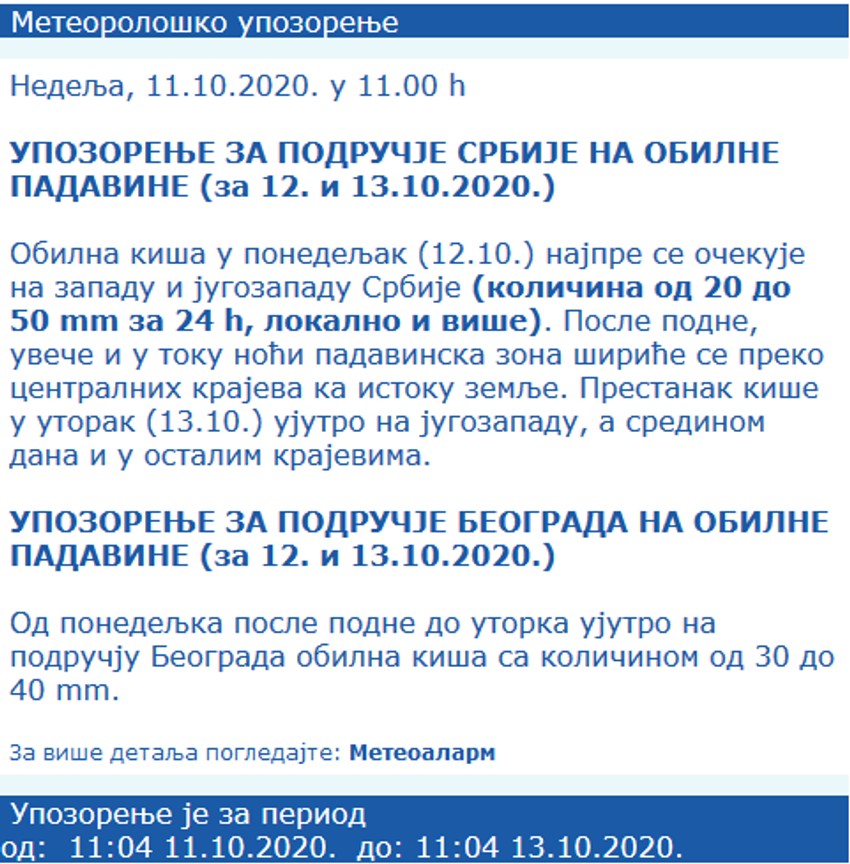 Republički hidrometeorološki zavod (RHMZ) izdao je upozorenje na obilne padavine na području Srbije za sutra i prekosutra. Zbog obilnih padavina očekuje se i nagli rast reka, te su moguća izlivanja i bujice.