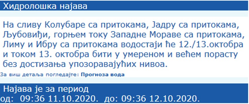 Prema najavi iz RHMZ, na slivu Kolubare sa pritokama, Jadru sa pritokama, Ljuboviđi, gornjem toku Zapadne Morave sa pritokama, Limu i Ibru sa pritokama vodostaji će u ponedeljak i utorak biti u umerenom i većem porastu bez dostizanja upozoravajućih nivoa.