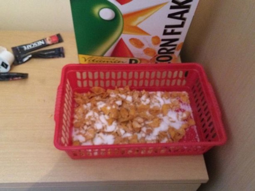 Kako u sobi nije imala ni osnovnog posuđa, ona je morala da jede kukuruzne pahuljice viljuškom iz plastične korpe koju je našla u sobi.