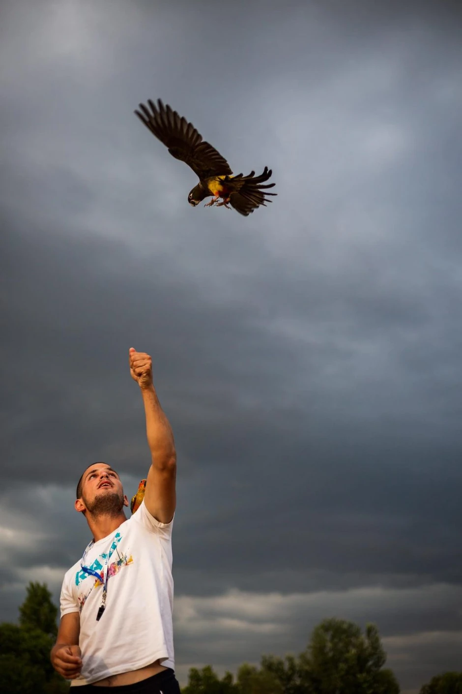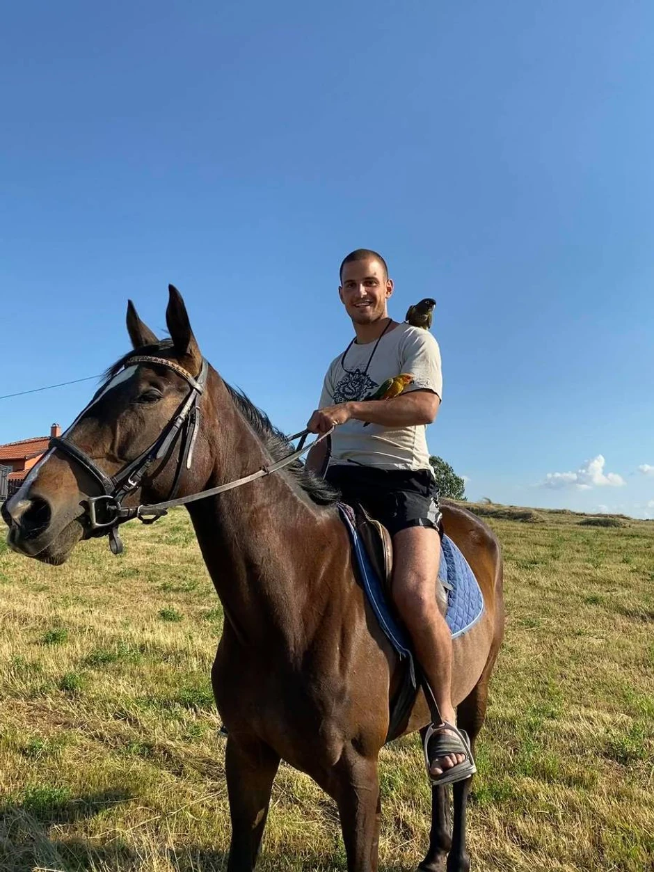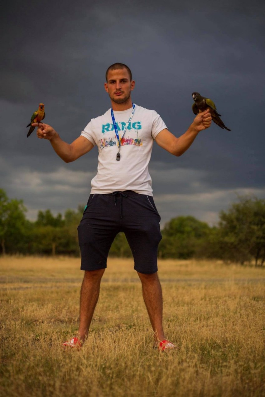 Kada je na svom Fejsbuk profilu pokazao kako provodi svoje slobodno vreme, jašući konja dok mu ptice sleću na ruku i prate ga u stopu, svi su mislili da je reč o sokolovima. Međutim, Uroš Vojinović (32) iz Aranđelovca je trener karatea, zaljubljenik u životinje i promoter slobodnog leta, ali ne sokolova, već papagaja.