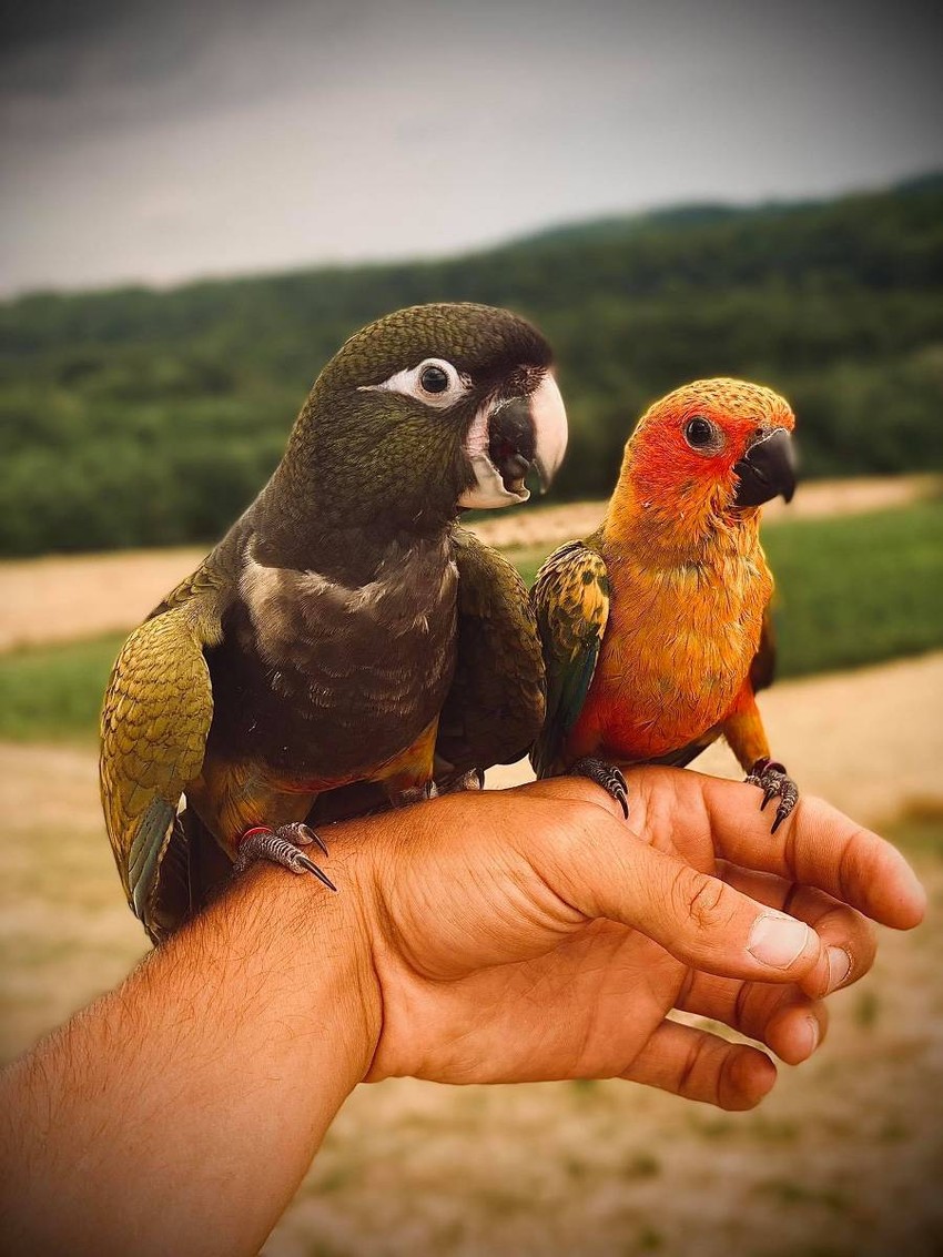 Oba papagaja su južnoameričke vrste. Jedan je "patagonac", a drugi "sunčana aratinga".