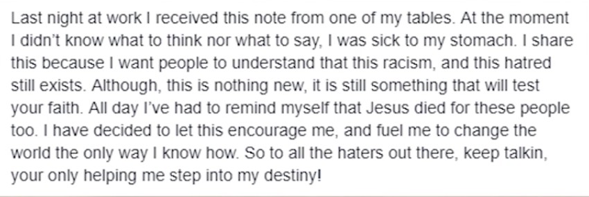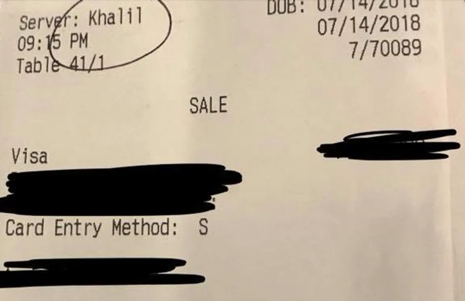 Halil Kavil, konobar jednog restorana u Odesi u Teksasu, podelio je na Fejsbuku svoje iskustvo sa rasističkim ispadima. On je rekao da mu je postalo mučno kada se vratio do stola koji je opsluživao i video poruku na računu.