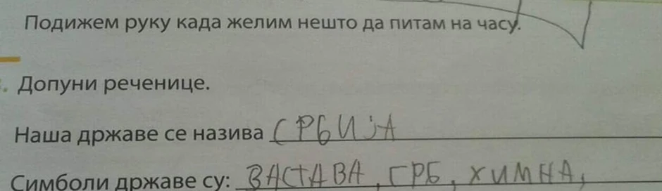 Anonimni osnovac, učenik nižih razreda, dopunjavao je prazna polja u radnoj svesci na kojima je trebalo da dopiše kako se zove naša država, šta su simboli države, kako glasi himna Srbije, kao i da oboji zastavu koja je stajala na dnu stranice. Međutim, u pitanju vezanom za himnu malo je permutovao reči, pa je umesto "Bože pravde" njegov odgovor bio "Bože prosti".