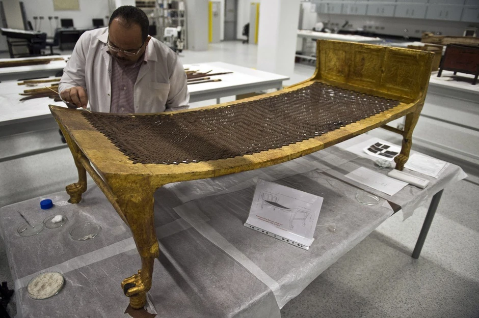 Posetioci muzeja moći će, između ostalog, da vide i Tutankamonove sandale stare 3.500 godina, koje su obnovljene novom tehnikom uz primenu specijalnog lepka. Ukrasni vez s perlicama bio je potpuno uništen, a đonovi su se raspali, ali sada su ponovo “oživele”, kaže restaurator Muhajed Jusri.