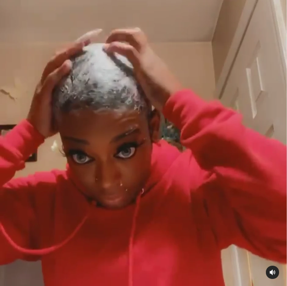 Na objavljenom video-snimku se vidi kako je sebe potapšala po glavi da pokaže kako je sprej od lepka pretvorio njenu kosu u čvrstu, nepomičnu kacigu.