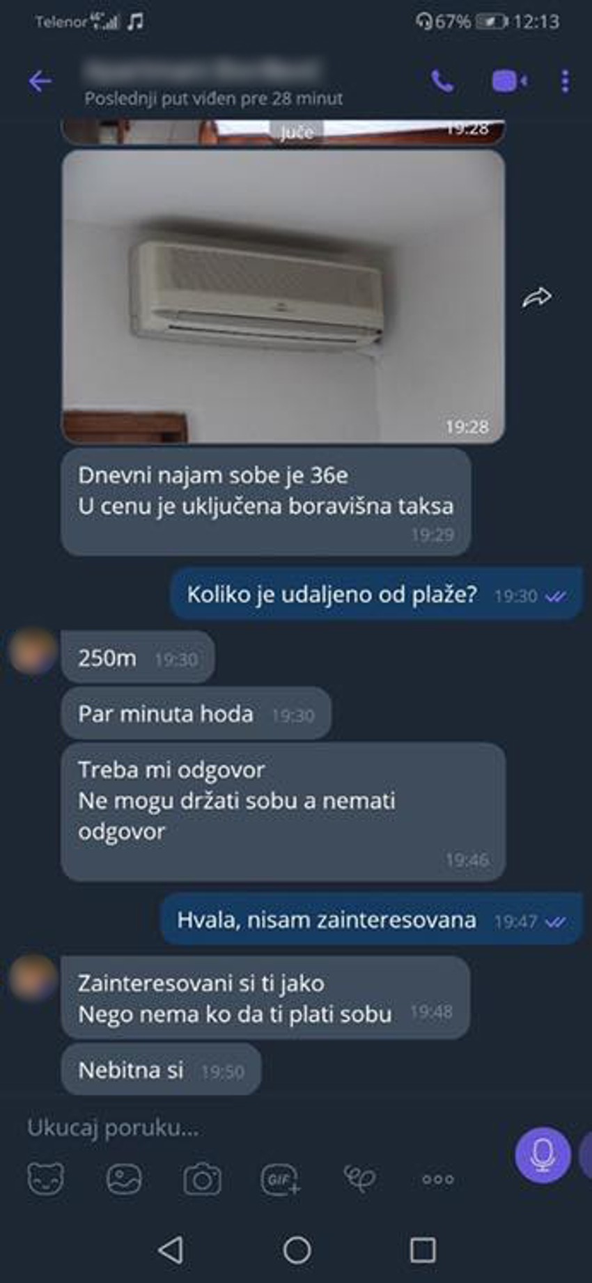 - Zainteresovana si ti jako, nego nema ko da ti plati sobu. Nebitna si - napisao je on vidno pogođen činjenicom da neće izdati apartman.
