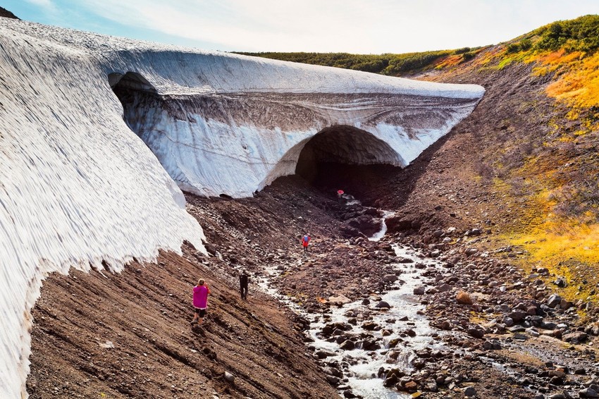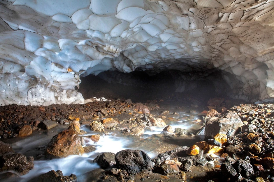 U toplo proleće pored vulkana na poluostrvu Kamčatka prolazi voda koja oblikuje ove prelepe providne tunele. Kako se slojevi leda tope godinama, tako za sobom ostavljaju ovaj svetleći efekat unutar pećine.