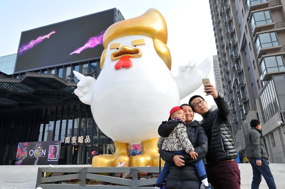 Slaveći dolazak Godine petla po lunarnom kalendaru jedan trgovački centar na severnu Kine postavio je ogromnu skulpturu petla koji umesto kreste ima prepoznatljiv pramen Donalda Trampa.