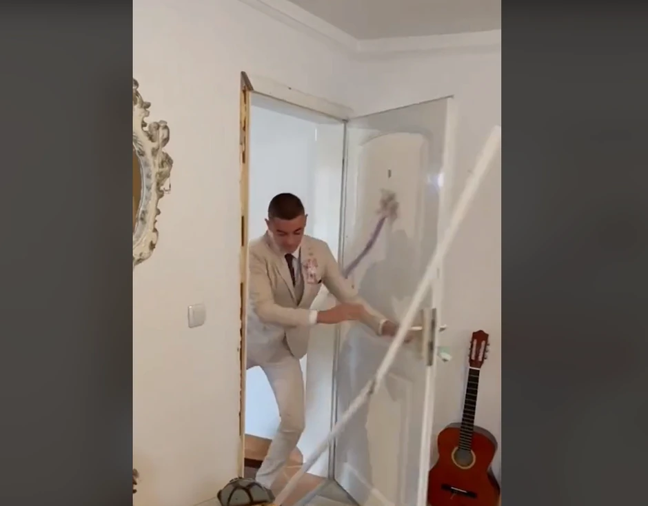 "Ako niste znali ovako se ulazi po mladu", stoji u opisu videa u kom se može videti da mladić pokušava da uđe u sobu gde se nalazi mlada i njena drugarica, ali da ne uspeva iz prve. Kada je shvatio da će normalan ulazak biti nemoguć, momak je iz sve snage udario vrata koja je potom polomio, ali i uspešno ušao.