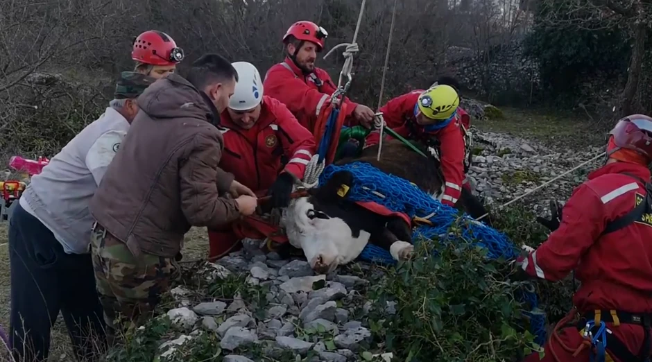 Pripadnici splitskog ogranka Gorske službe spasavanja iz jame u Lećevici izvukli su kravu tešku 250 kilograma.