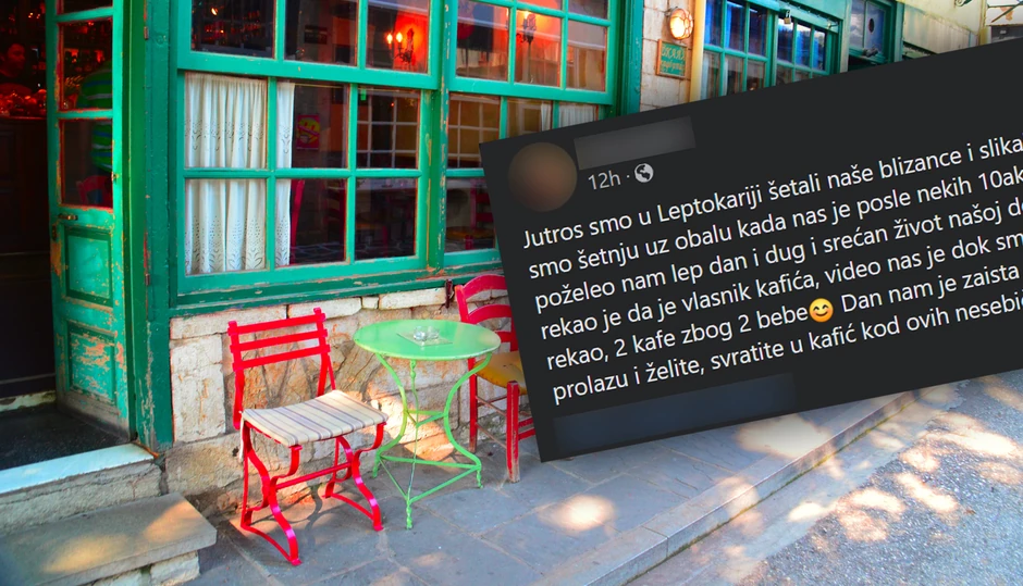 "Jutros smo u Leptokariji šetali naše blizance i slikali se na klupi prekoputa kafica. Nastavili smo šetnju uz obalu kada nas je posle nekih desetak minuta sustigao čovek na skuteru i doneo dve kafe, poželeo nam lep dan i dug i srećan život našoj deci. Pitali smo ga ko je i zašto nam daje kafu, rekao je da je vlasnik kafića, video nas je dok smo se fotografisali i poželeo je da nas časti, kako je rekao, dve kafe zbog dve bebe.