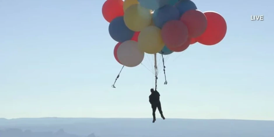 „Ovo je bilo fenomenalno“, rekao je profesionalni iluzionista i mađioničar Dejvid Blejn kada se spustio sa visine od 7.600 metara na koju su ga odneli baloni punjeni helijumom. Tridesetominutni let strimovan je uživo preko Jutjuba.