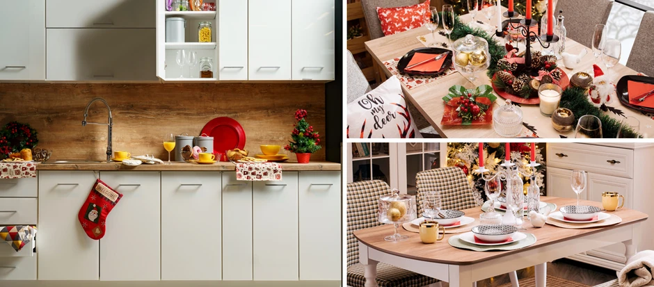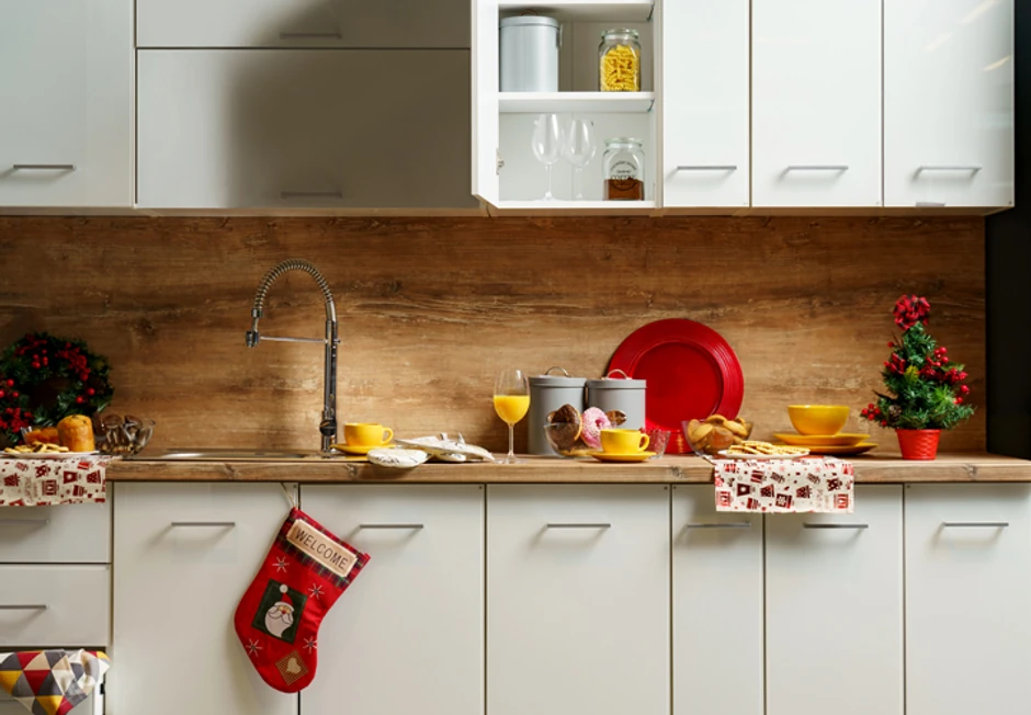 Ukoliko vam je radni prostor u kuhinji sužen, možete kao dekoraciju zakačiti novogodišnji venčić na kukice za krpe ili kuhinjski pribor, a kao dekoracija, ali i za serviranje hrane može poslužiti crveni svečani tanjir.
