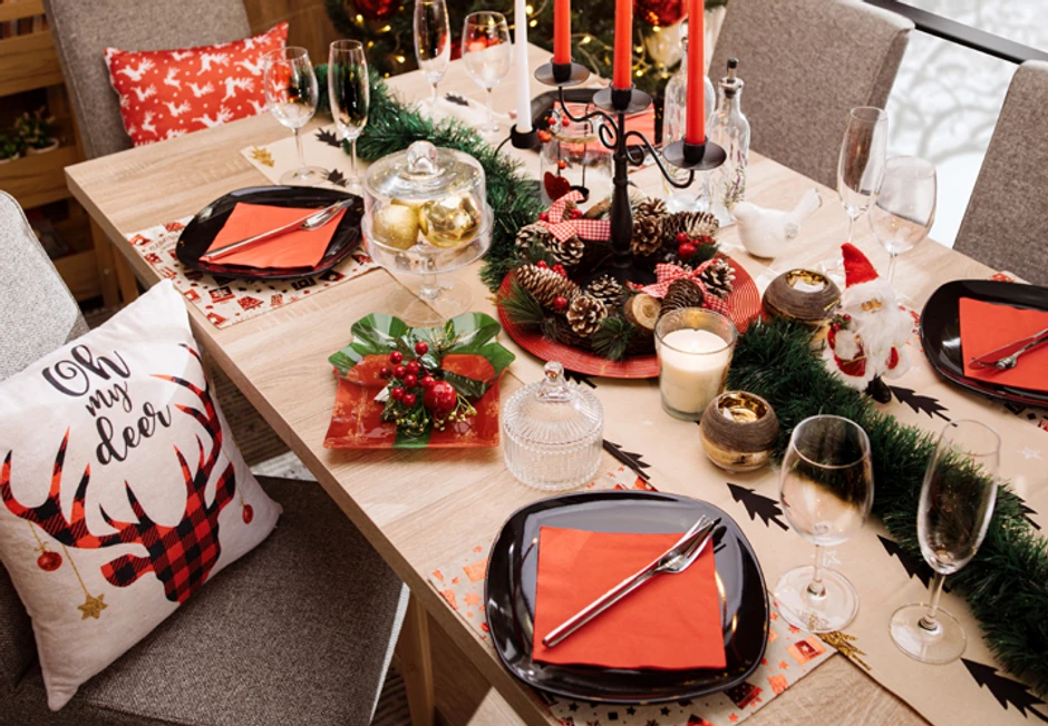 Trpezarijski sto ne mora nužno da bude prekriven stolnjakom, već po sredini stola, pored tradicionalne Božićne dekoracije, kao detalj možete dodati nadstolnjak sa motivom jelkica, a ispod svakog tanjira postaviti podmetač za tanjir, koji će obogatiti prazničnu dekoraciju.