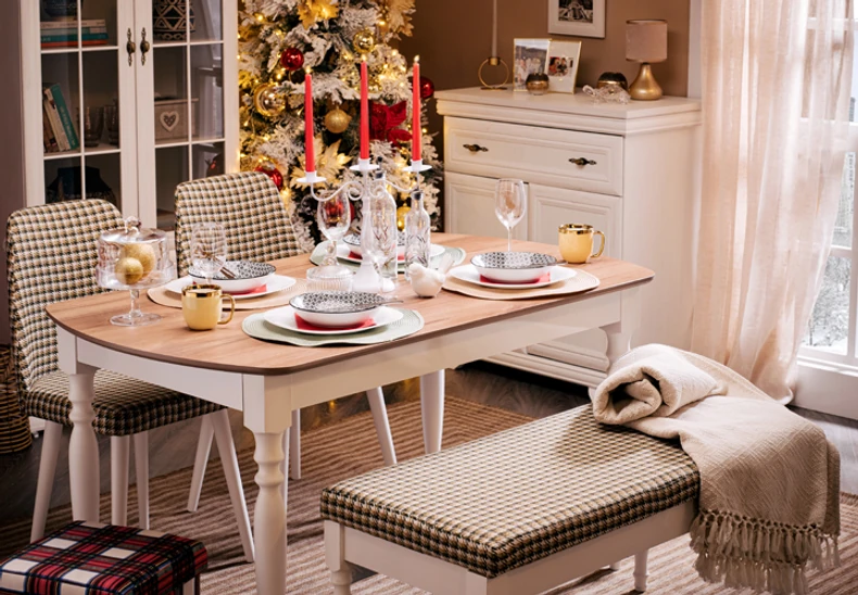 U slučaju da ste novogodišnju jelku smestili u trpezariju, ne morate preterivati sa dodatnom prazničnom dekoracijom. Dizajneri enterijera Forma Ideale predlažu da odaberete neke klasične komade nameštaja, poput trpezarijske klupe B118, koja pored praktičnosti predstavlja i estetski privlačno rešenje. U kombinaciji sa trpezarijskom stolicom S647 i stolom M367 doprinosi rustičnoj eleganciji i sasvim sigurno će ulepšati svaki trpezarijski ambijent. Na sto možete da dodate svećnjak i par novogodišnjih kugli koje ćete koloritno uskladiti sa ukrasima na jelci i ceo prostor će dobiti posebnu toplinu.