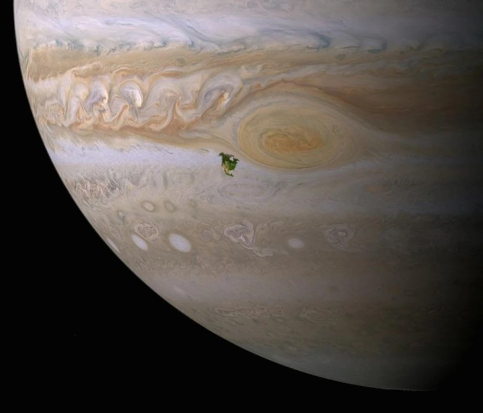 Ova zelena "mrlja" je Severna Amerika, postavljena pored Jupiterove Velike crvene pege. Olujni vetar u Jupiterovoj atmosferi progutao bi celu Zemlju.