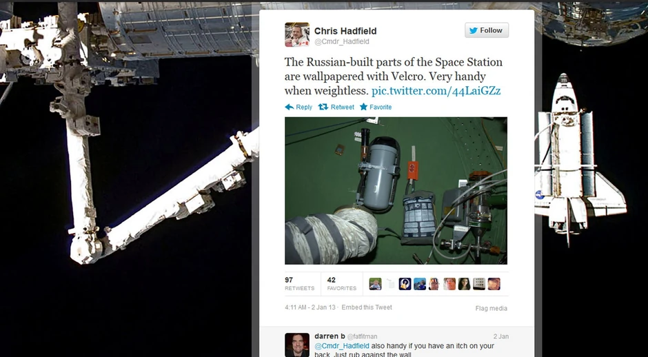 Kanadski astronaut Kris Hetfild je samo nekoliko nedelja u svemiru, u sklopu šestomesečnog boravka na Međunarodnoj svemirskoj stanici, već je aktivan na društvenoj mreži Tviter, gde komunicira sa junacima “Zvezdanih staza”.