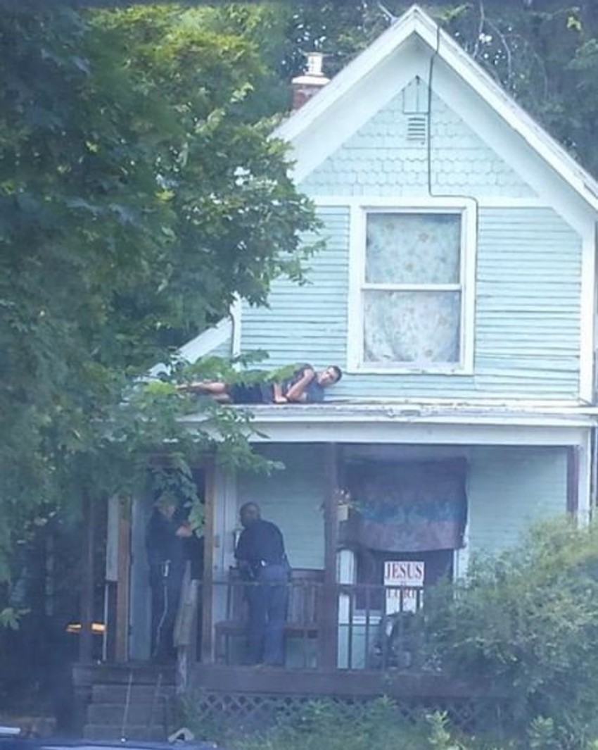 Fotografija dva policajca koja su došla da privedu nasilnika u Grand Repidsu u Mičigenu raširila se internetom. Na njoj se vidi kako se oni na pragu kuće dogovaraju kako da nađu čoveka zbog kog su došli, dok on samo na metar iznad njih leži na krovu trema.