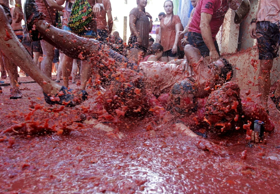 Iako scene sa ovih fotografija podsećaju na horor film, zapravo se radi o čuvenoj "paradajz bitki". Naime, desetine hiljada ljudi učestvovalo je na godišnjoj zabavi gađanja paradajzom "Tomatina", koja se održava u španskom gradu Bunjolu.