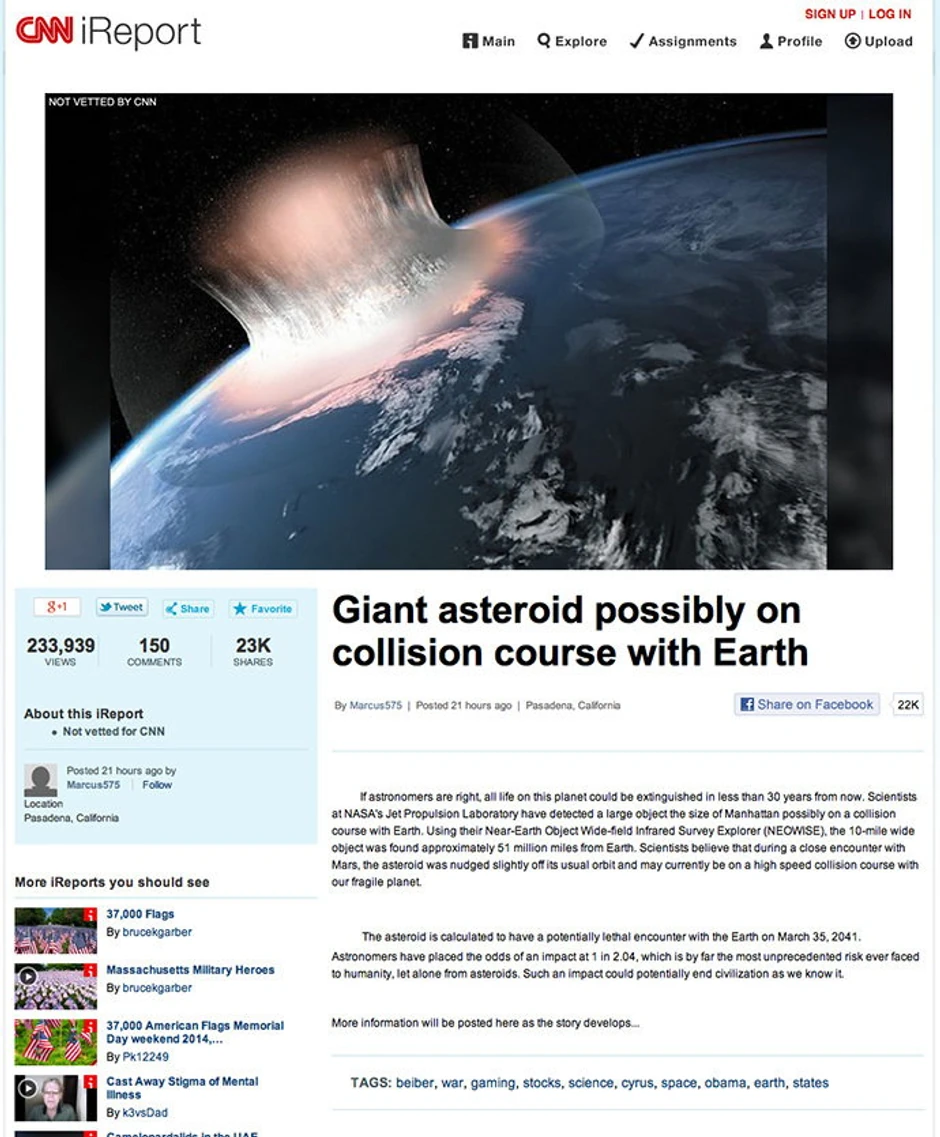 Zanimljivo je to kako nisu odmah primetili da je vest lažna, s obzirom na je pisac kao datum susreta asteroida i Zemlje naveo nemogući 35. mart.