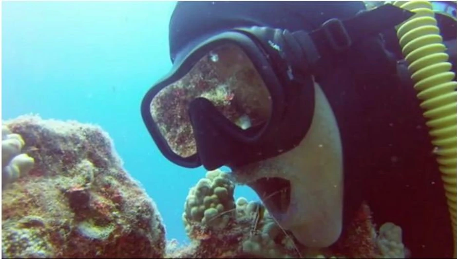 Ronilac koji je snimao svoje ronjenje u okeanu u jednom trenutku je skinuo masku za disanje i dopustio škampu da ušeta u njegova usta.