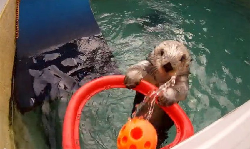 Edi je morska vidra koja se, osim plivanjem, “bavi” još jednim sportom – košarkom.