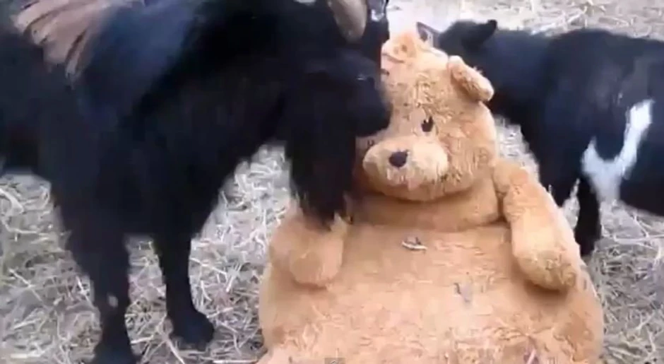 Jarac se toliko iznervirao da je uporno gurao plišanog medu i skakao po njemu. Mnogi kažu da je ovo tipično ponašanje za jarca koji je poznata po agresivnijem stavu od svoje ženke-koze.