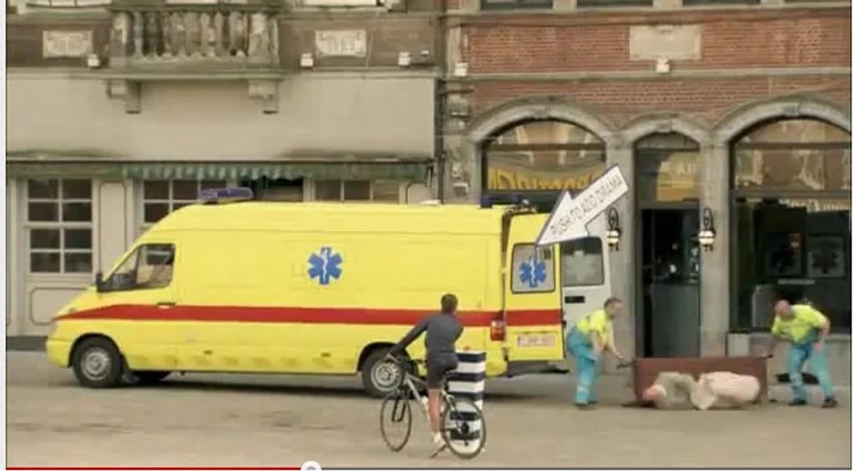 Kola hitne pomoći, ranjenik koji ispada sa nosila, polugola bajkerka u crvenom vešu, masovna tuča i armija ragbista zaposeli su trg u roku od nepunog minuta na opšte zaprepašćenje, ali i oduševljenje okupljenih znatiželjnika.