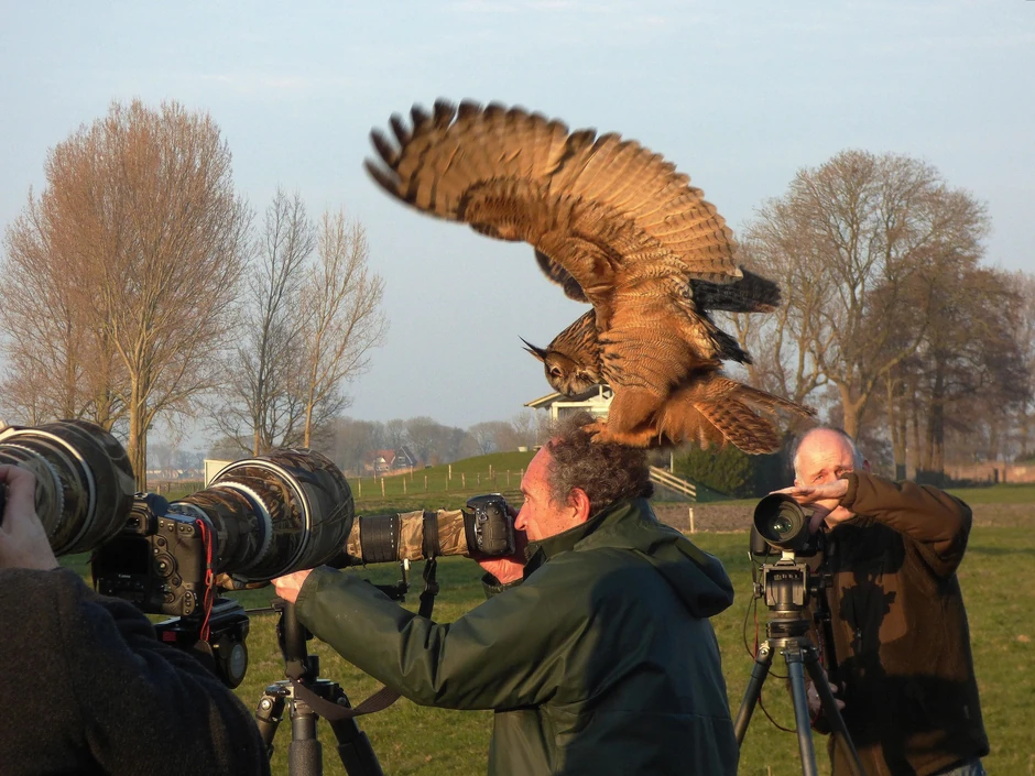 Verovatno želevši da otera ove posetioce sa čudnim napravama, sova je skočila na glavu fotografa, na šta su ostali fotografi brzo reagovali, pa je jedan od njih napravio uspelu fotografiju ove pobednele ptice.