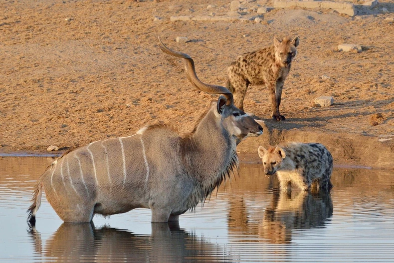 Ženke velike kudu antilope žive u malim krdima, dok mužjaci žive usamljeno i izbegavaju prostrane čistine bez drveća i žbunja. Brzina i izdržljivost im nisu jača strana, već se od grabljivaca spasavaju skrivanjem i lukavstvom. Da zaista umeju da budu lukavi, potvrđuje i ova kamerom zabeležena priča o kudu antolopi, koja je čoporu gladnih hijena pobegla tako što se sakrila u krdo zebri.