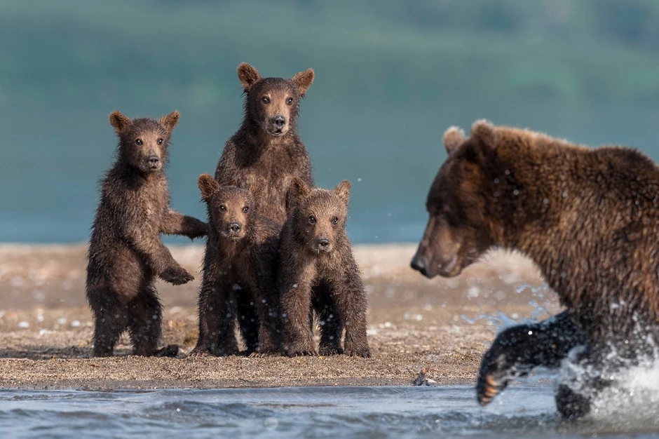 Ruski fotograf Sergej Ivanov je iskoristio jedinstvenu priliku i fotografisao jednu porodicu medveda na Kurilskom jezeru na Kamčatki. Na fotografijama se vidi četiri medvedića koji sa obale posmatraju svog tatu koji pokušava da ulovi lososa za večeru.