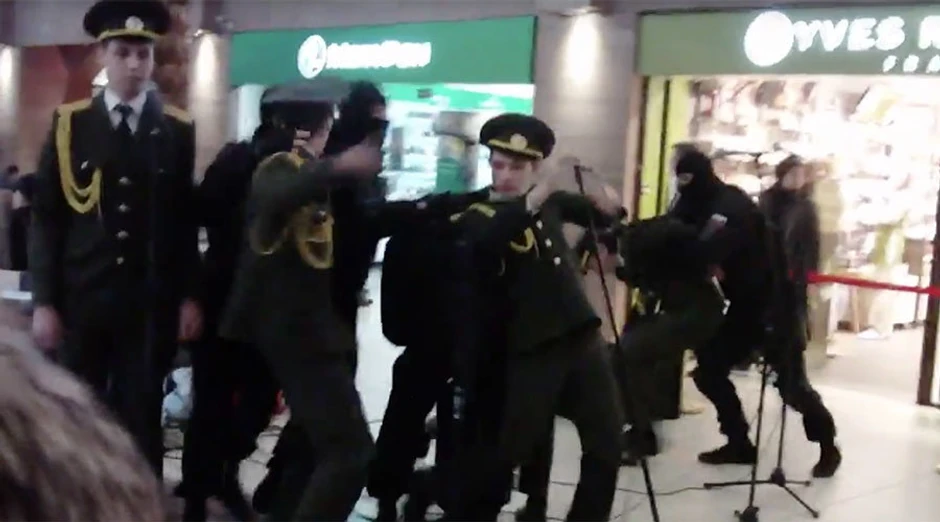 Pet članova hora ruske armije izvodilo je u Sankt Peterburgu pesmu Sema Smita "Writting's On The Wall", koja je urađena za najnoviji Bondov film, kada su komandosi dotrčali do njih, zgrabili ih i oborili na zemlju.