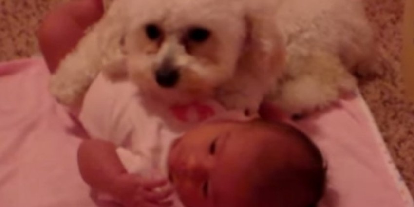 Mala bela pudla ležala je kraj bebe kad su njegovi vlasnici upalili fen za kosu.