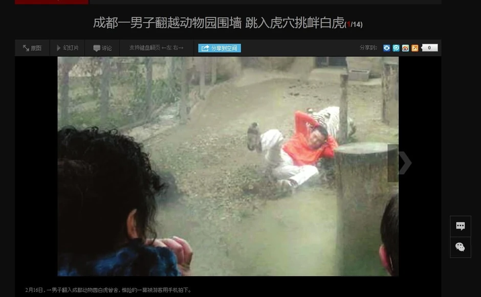 “Uspentrao se uz spoljašnju stranu kaveza i uskočio unutra, verovatno očekujući da će tigrovi skočiti na njega”, ispričao je očevidac Feng Lin.