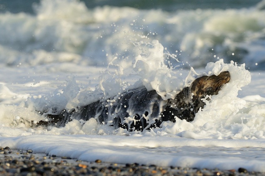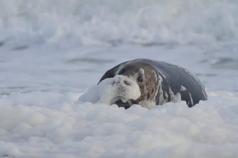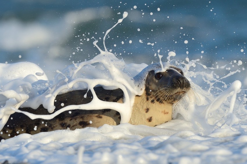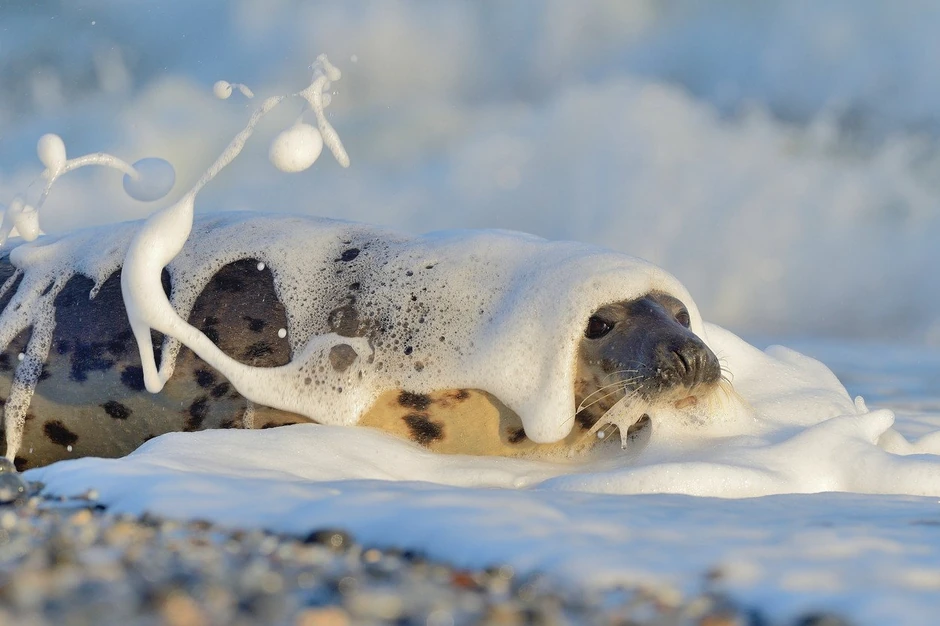 Neke se odmaraju na plaži, a neke u plitkoj vodi, zaista je izgledalo kao da uživaju u tome. Duvao je jak vetar. Fokusirao sam se na foke u vodi zbog tih ludih zapljuskivanja. Pena se ne ponaša kao čista voda, bilo je fascinantno. Taj efekat se ne vidi očima, ali je moguće zabeležiti ga kamerom. Nije lako dobiti takve fotografije, fotograf mora da bude strpljiv, ne bude svaki talas dovoljno snažan da stvori toliko mehurića”, ispričao je fotograf.
