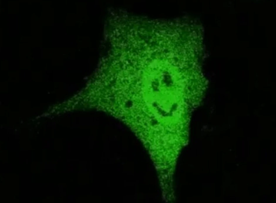 Usred ogleda, naučnici su primetili da im se protein ruga, odnosno "osmehuje". Krug na gornjoj fotografiji je, zapravo, nukleus ćelije, a tamna mesta - "oči" i "usta" smajlija - predstavljaju mesto na kojem se protein blokirao.