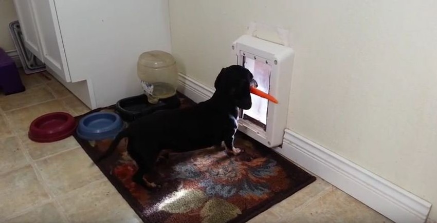 Slatki jazavičar želeo je da izađe nepolje kroz vrata za mace. Međutim, zbog dužine šargarepe koju je nosio u ustima, nikako nije mogao da prođe kroz njih. Nekoliko je puta pokušavao i svaki put se vratio nazad, a svom gazdi je bio toliko smešan da je morao da ga snimi.